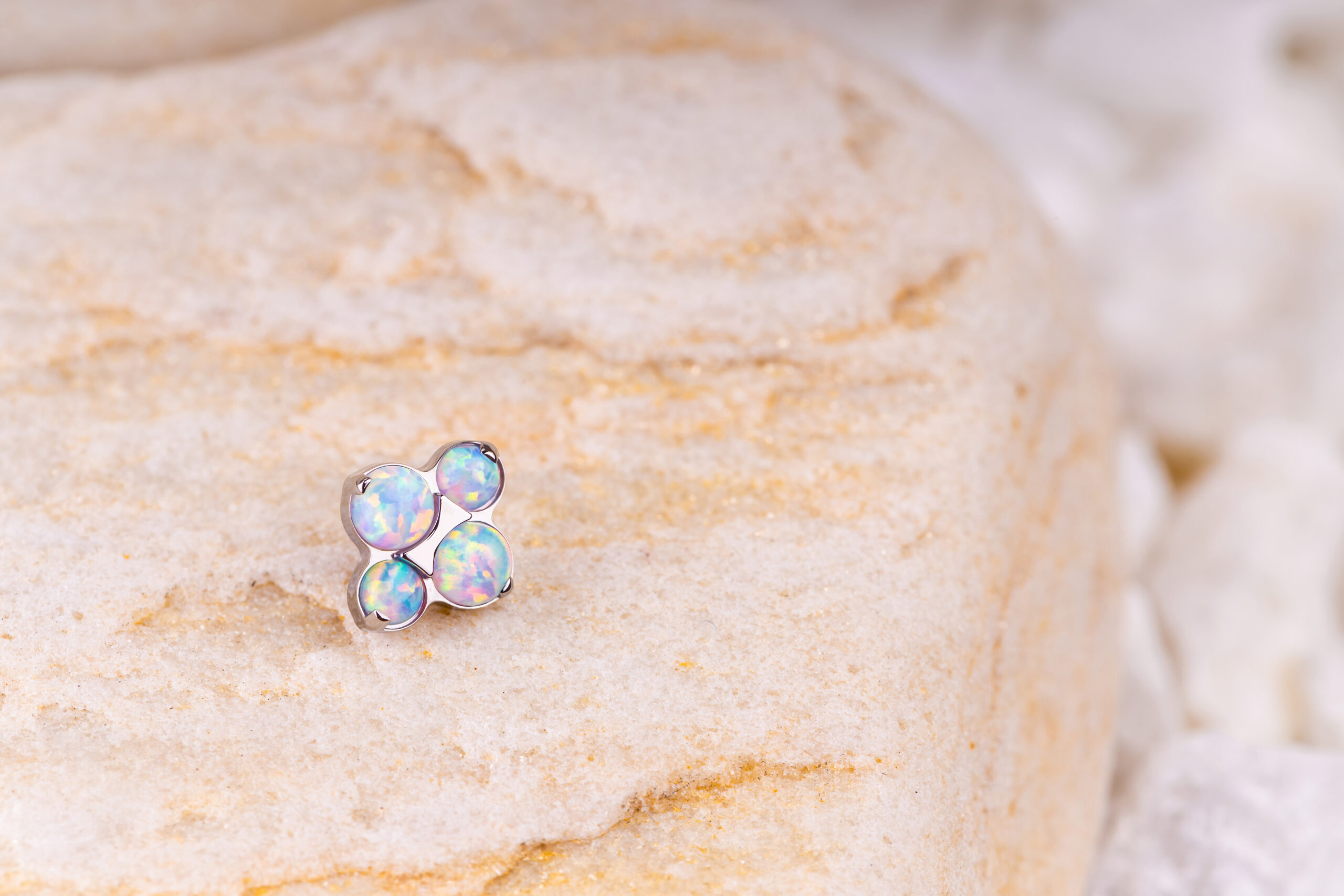 Un clou d’oreille délicat composé de quatre pierres lumineuses, disponible en blanc ou bleu, pensé pour illuminer l’oreille avec discrétion.